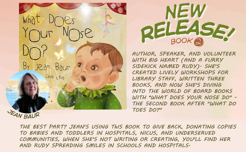 The first book in Jean's series of board books came out in October, 2025, and has found its way to some amazing places. She has donated copies to a NICU in Springfield, MA, for a community baby shower sponsored by The Elks, to every library in Connecticut, as well as to Read to Grow--a literacy organization in Branford, CT, and to the Alliance for Family Support. She recently also gave books to A Sacred Place--an organization that inspires hope for incarcerated women at York Correctional Institution and provides books and other gifts for their newborns. Her books are for sale in Connecticut at Bank Square Books in Mystic--they have signed copies, as well as The Blue Horse Children's Shop, also in Mystic, Franklin's General Store in Mystic Village and Celebrations in Deep River. The Stonington Free Library has copies for sale. In Rhode Island, the board books can be found at The Fun Store and Seaside Pharmacy in Westerly, as well as at Wakefield Books in the Wakefield Mall. And of course you can buy both books online. Please check the next tab, Dogs and Books to order. I m available for speaking events including bookclubs, writers workshops, and publishing forums, and storytime at libraries, schools, and community organizations. And yes, I make it fun with free coloring pages and bubbles.